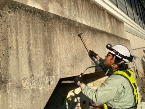 【橋やトンネルの点検業務】 トンネルや橋梁の崩落事故などが無いように、ひびわれや漏水、変形などがないかを点検する仕事です。 近接目視や打音検査等による点検を行います。