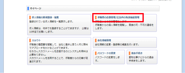 御社専用ページが表示されますので 「求職者の応募管理/広告料取消」ボタンを押してください 。