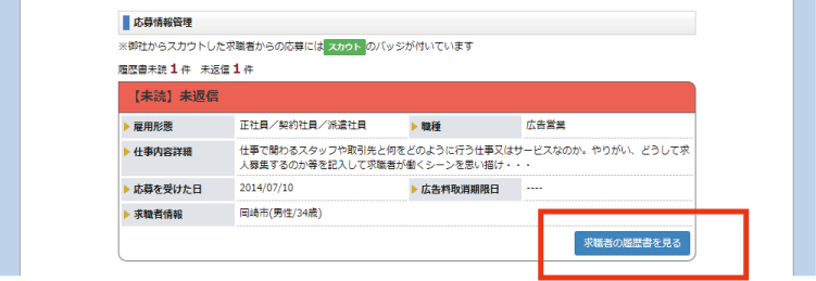 求職者からの応募が表示されてますので、該当する求職者の 「求職者の履歴書を見る」ボタンを押してください。