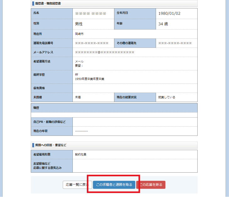 類選考の結果、この求職者と面接する場合は「この求職者と連絡を取る」ボタンをクリックしてください。