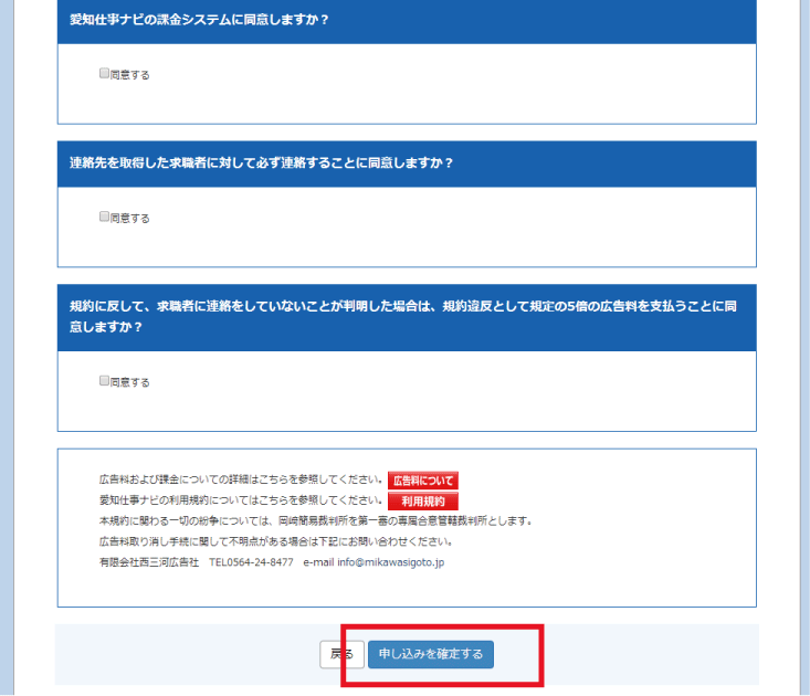 広告料に関する確認画面がでますので、同意できれば「申し込みを確定する」ボタンをクリックしてください。