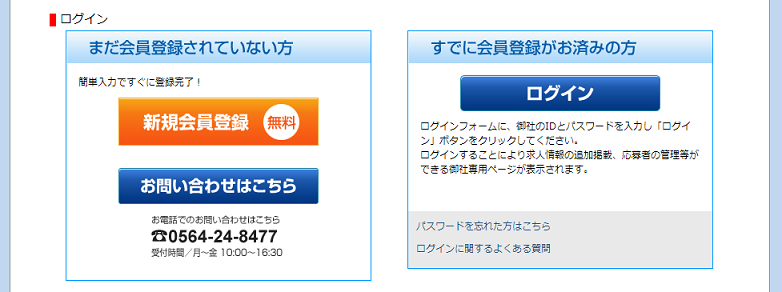 こちらは求職者専用のログインになります。企業の方のログインは上段右上の『求人広告掲載ボタン』を押してログインしてください。