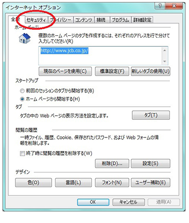 「インターネットオプション」ウィンドウの「セキュリティ」タブをクリックします。