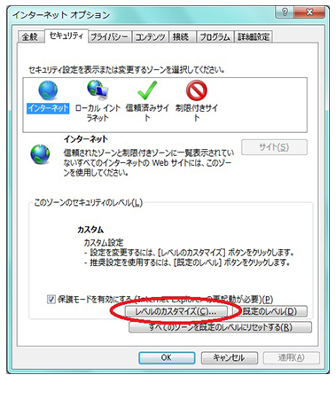 「このゾーンのセキュリティのレベル」内にある「レベルのカスタマイズ」をクリックします。