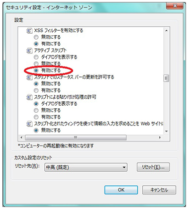 「セキュリティ設定」ウィンドウの「スクリプト」内にある「アクティブ スクリプト」を有効にします。