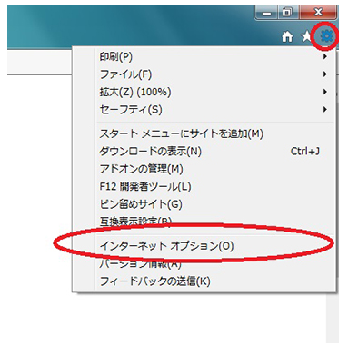 Internet Explorerを起動した状態で、ツールバーの「ツール」もしくは歯車のマークをクリックして、