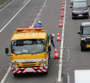 【道路規制業務】 規制エリアの設置や歩行者や車両の誘導を通して、道路の安全を守る仕事です。高速道路などの点検・工事を安全に行うために、チーム制でコーンや看板などの資機材を設置し、規制エリアを作ります。併せて車両の誘導も行います。 ※交通誘導警備のみの現場もございます。
